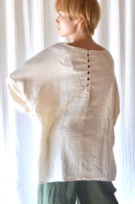 背中と袖口に並んだココナッツの小さなボタンがアクセント