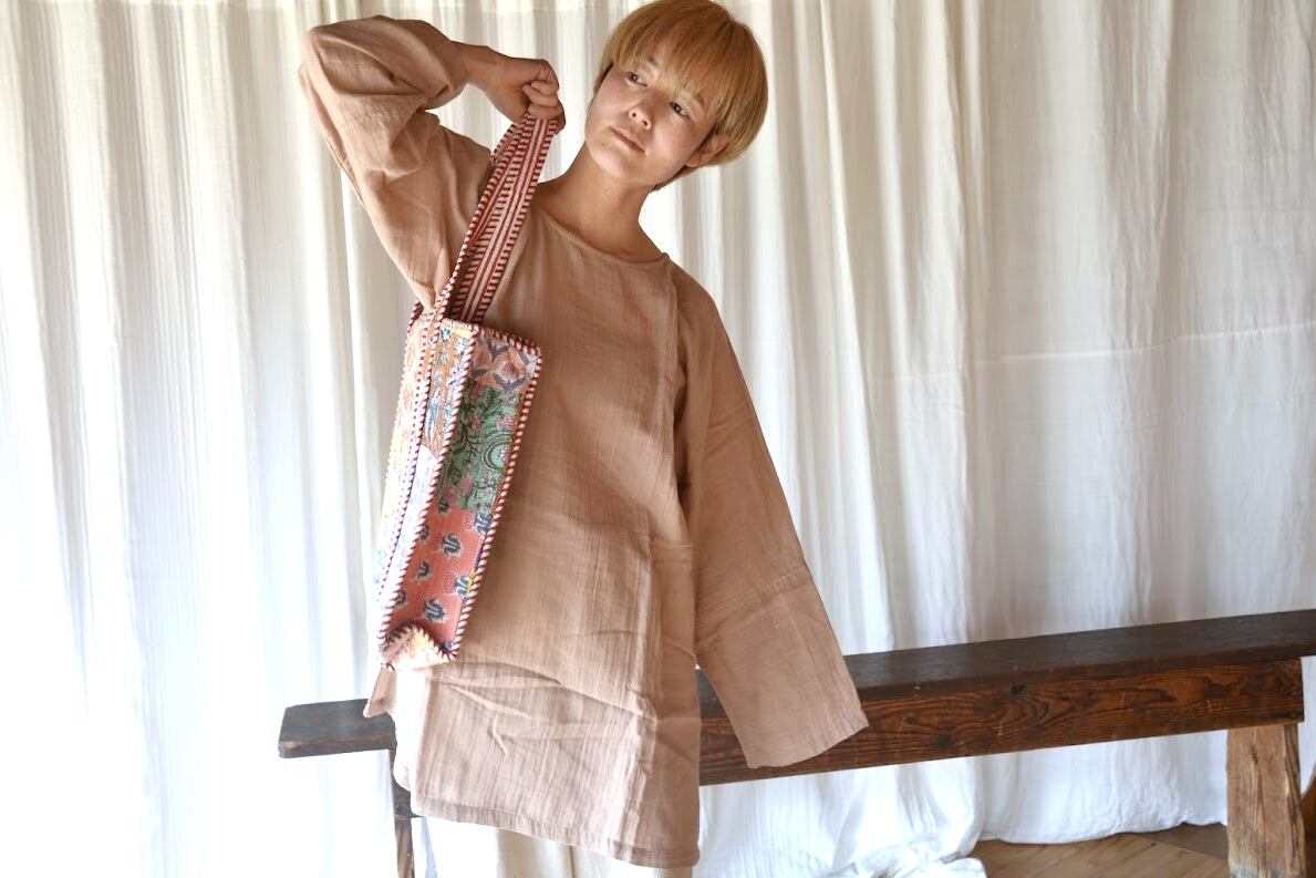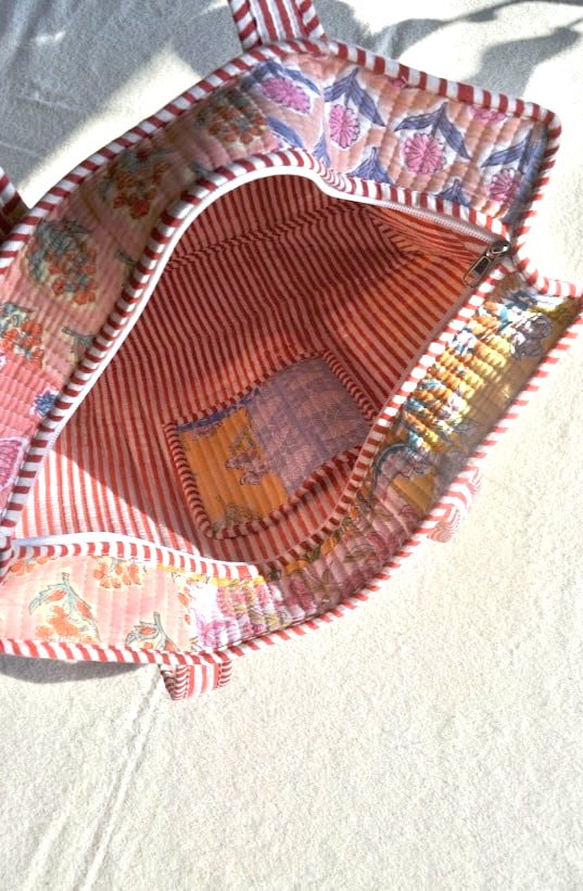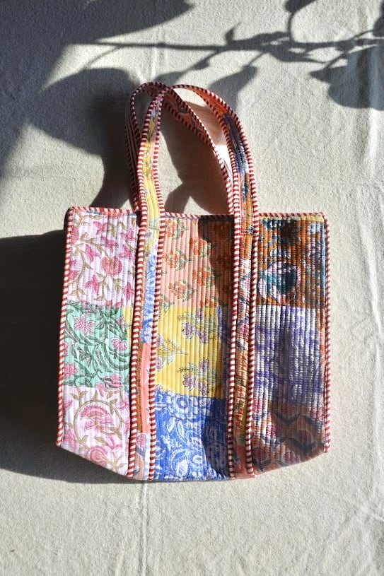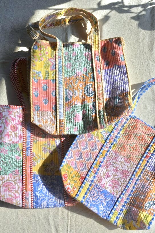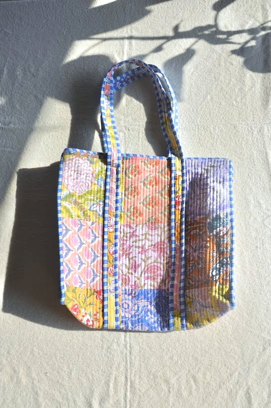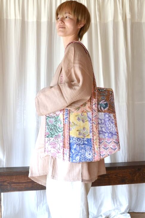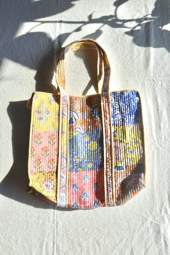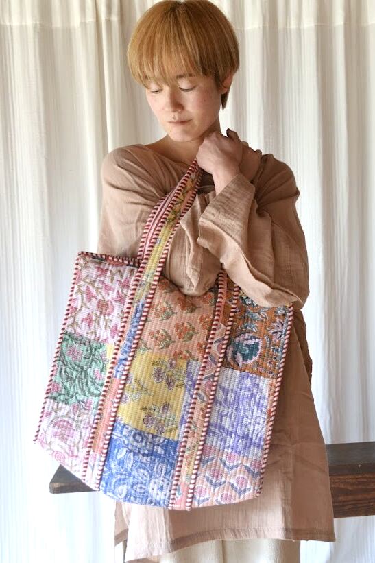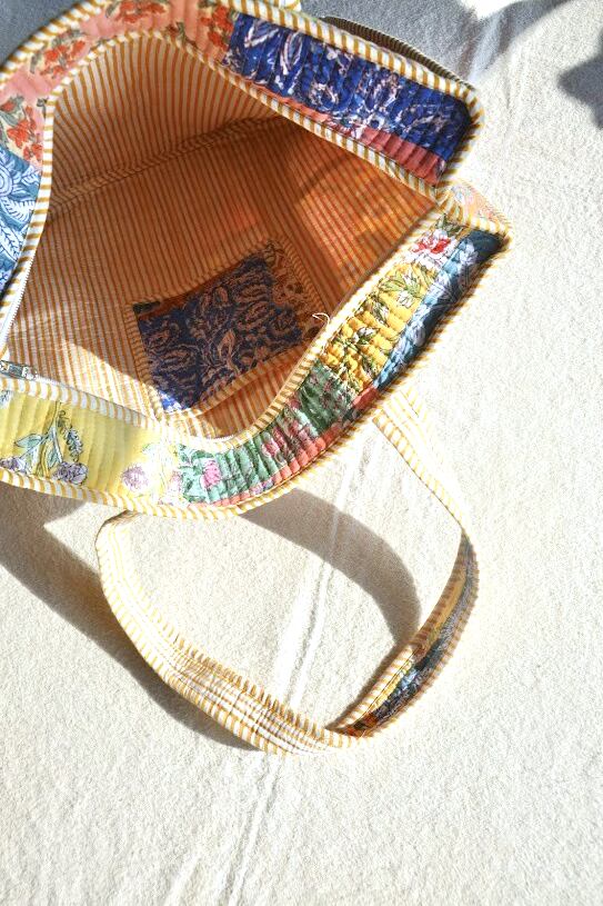 インドの伝統技法、ブロックプリントで仕立てたキルトバッグ。